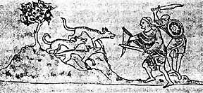 | Figure 3. The early 14th century Queen Mary's Psalter (British Library, London, MS Royal 2 B vii, folio 96) shows the "Ethiopian ants" (ant-dogs) attacking armed gold robbers. (Druce 1923 and Kevan 1992). |